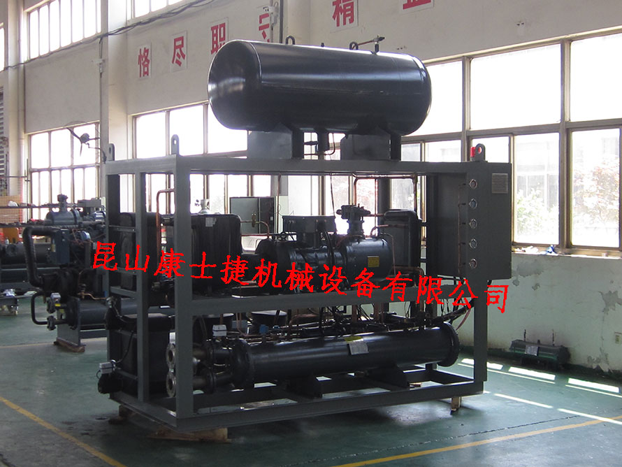 醫(yī)藥化工反應熱低溫冷卻用復疊制冷機組系統(tǒng)由高溫部分和低溫部分組成.其低溫部分提供所需的深冷能力,采用R13、R23等低溫制冷劑,但這類制冷劑的冷凝溫度要求很低,同等壓力下用冷卻水難以將其冷凝。高溫部分使用中溫制冷劑循環(huán),其作用是用于冷凝低溫制冷劑,高溫部分和低溫部分共用一個蒸發(fā)冷凝器而“復疊”,從而組成應用兩種制冷劑的復疊式制冷循環(huán)。低溫制冷機組是我公司主要技術(shù)人員通過低溫冷水機組設計經(jīng)驗,結(jié)合國內(nèi)外同類產(chǎn)品的先進技術(shù)而設計開發(fā)的新低溫制冷機組,具有高效、節(jié)能、環(huán)保、高可靠性等特點,多項先進技術(shù)的應用,使該產(chǎn)品的綜合技術(shù)水平達到**水平。